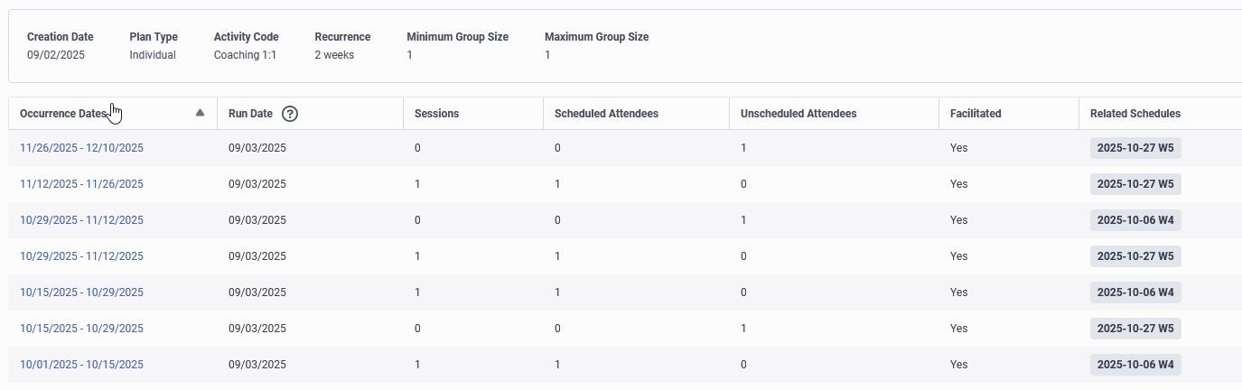 - If set to the same as the occurrence periods, 2 weeks, it could cause the Activity Plan to only schedule sessions on alternative occurrences, as the set day constraint doesn't allow for a full 2 weeks between sessions.