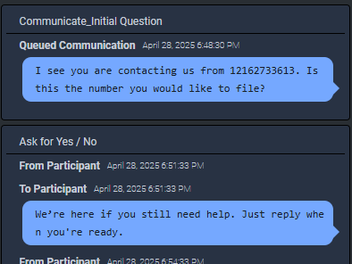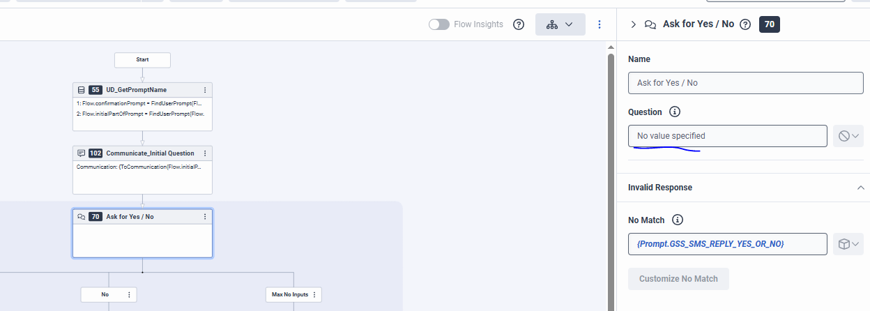 I'm building SMS flow and want it to ask Yes/No question, but based on requirements I need to play initial yes/no question only once, if No Input happens - prompt need to be different. As workaround I set 'Communicate' block with initial question in front of Yes/No block (which doesn't send any question).