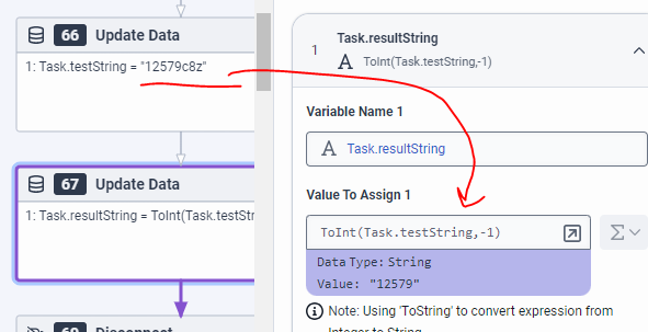 Task.resultString = ToInt(Task.testString, -1) \\ we'll get 123 here
