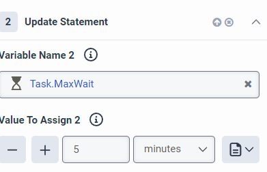 - Using update statement to capture 5 mins under a variable Task.maxQueueTime == 5(integer)