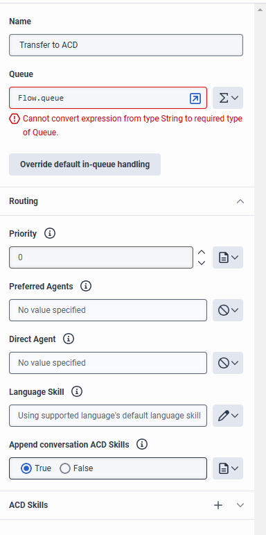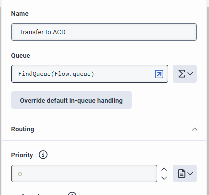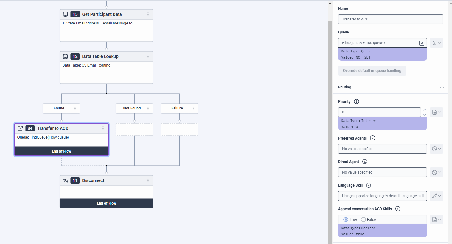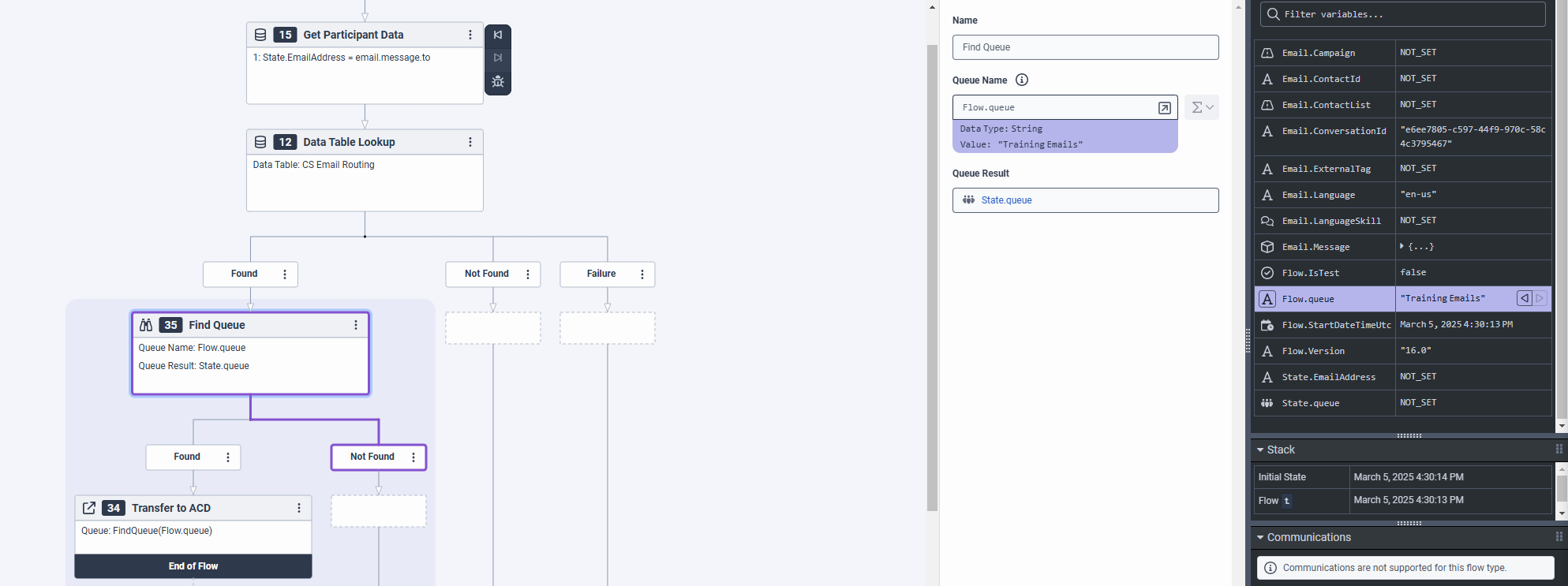 How do I write my transfer to ACD to flow that queue name that is listed in the data table? I have tried FindQueue(Flow.Queue) as well as Flow.Queue and have not been successful with the email actually going to queue.