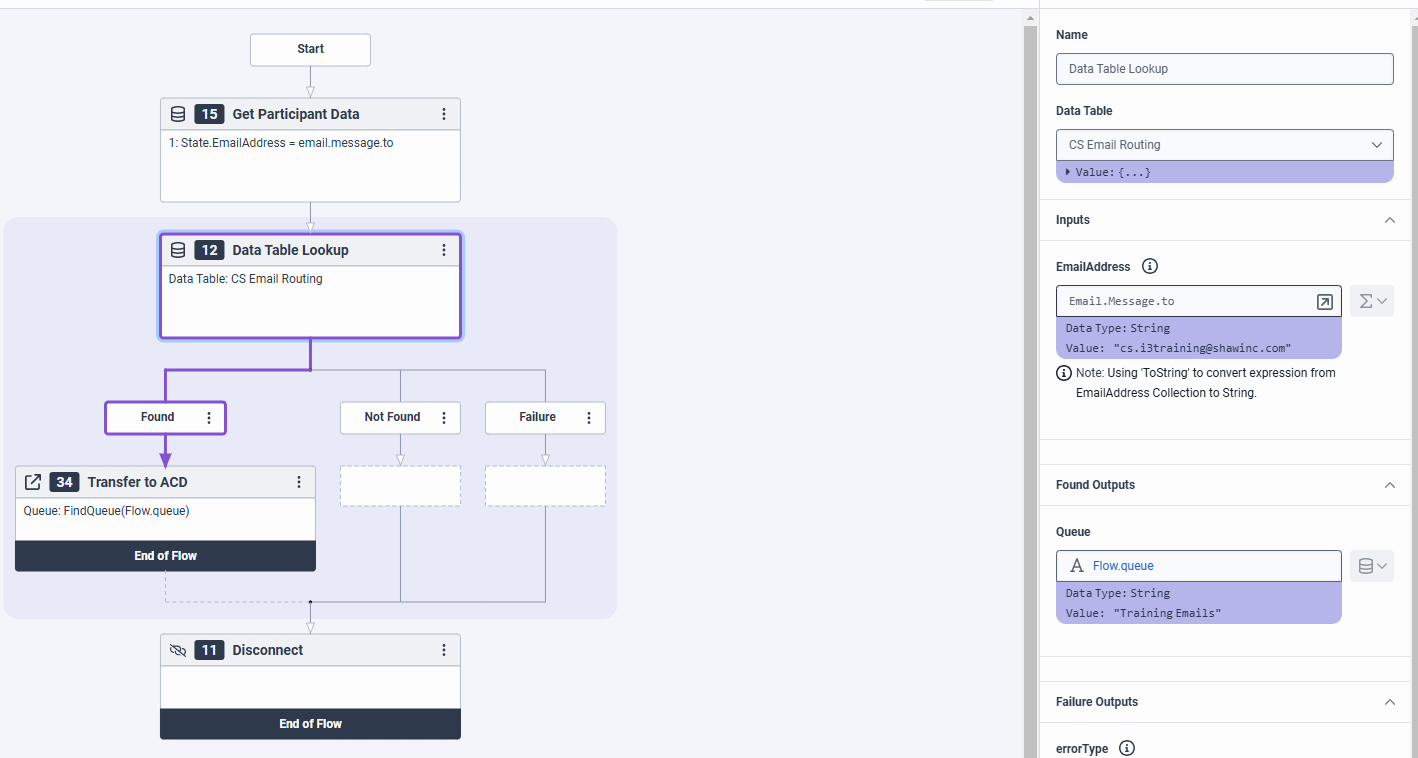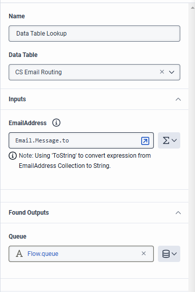 I am creating an Inbound Email Flow where we get the To Address from the email, then look at a data table where it is found, and it will send it to a specific queue. I am having trouble writing the expressions to make this work successfully.