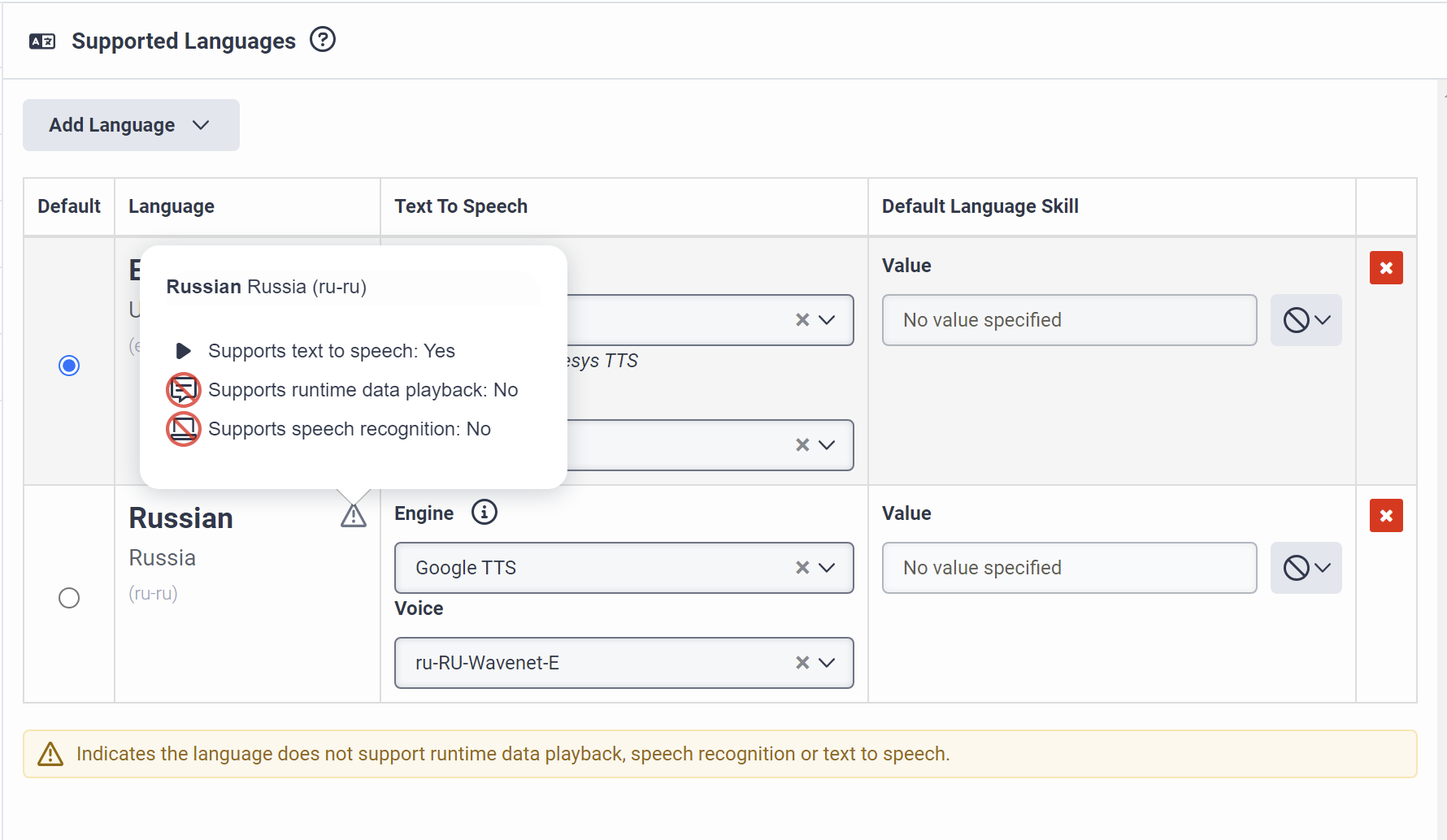 One of our customers requires Russian for their Google Dialogflow CX Voice Bot connected to Genesys Cloud CX. I enabled Google TTS in our Genesys environment, but when I select Russian in the architect flow (Supported Languages), I get the following errors:
