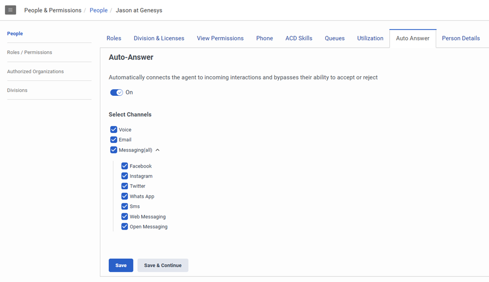 With the introduction of auto answer for digital interactions, agents can now be connected to incoming messages faster than ever! If an agent is available and has capacity based on their Utilization limits, the system will automatically accept the interaction on their behalf. Configuring auto answer for digital interactions is easy-just head to the Auto Answer tab in People and Permissions and select your preferred settings.