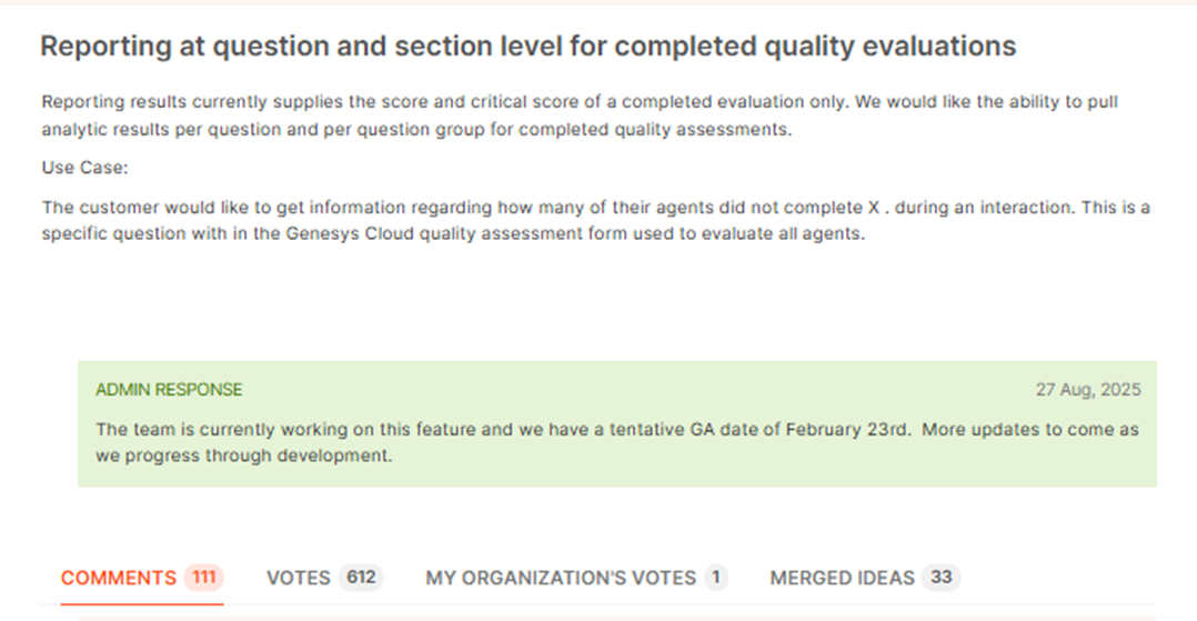 Keen to get some more information on this reporting solution for Genesys Quality Evaluation forms. Does anyone know if the planned solution will include reporting ability on comments linked to individual questions? Also reporting ability on any feedback that the Quality evaluator provides to a question response?