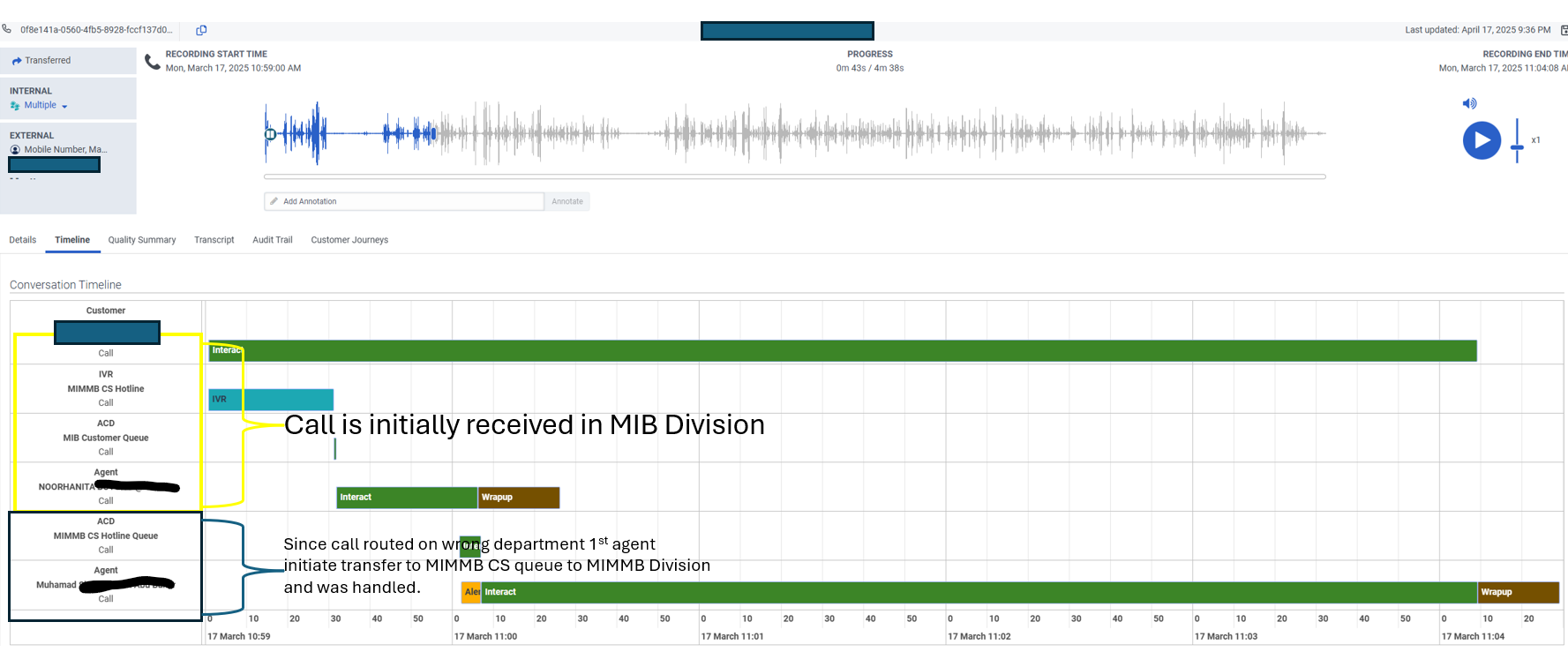 here is the screenshot provided by the supervisor where he can view/listen the calls that his agent transfer to queue on the other division.