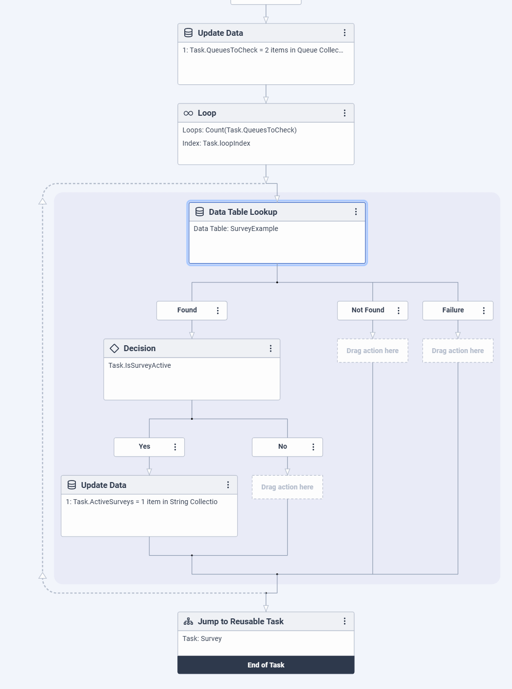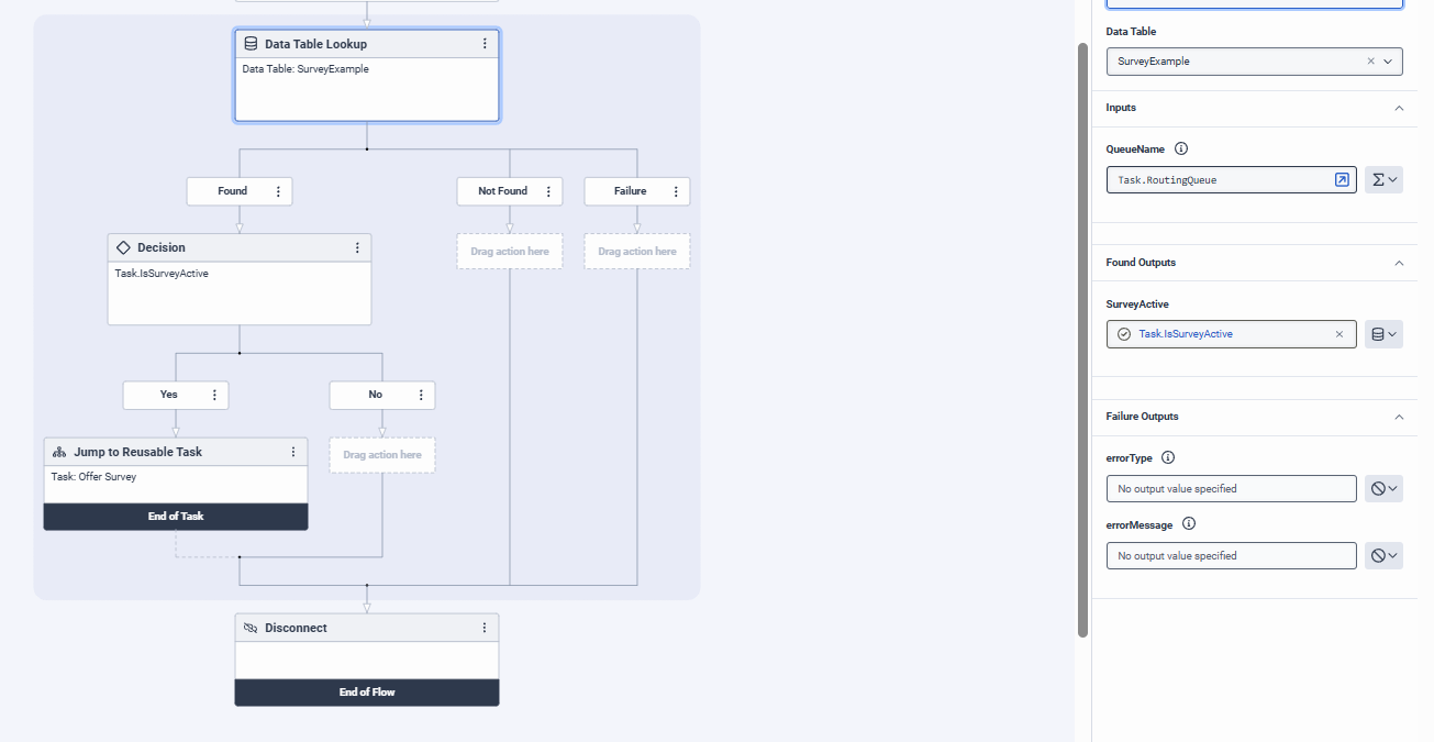 Well it the data table lookup will happen, it will find the Row with Queue1 and set Task.isSurveyActive to false and go down the no path in my decision, I don't need to check anything else.