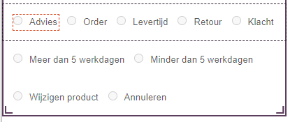 With that in mind, I can easily make some Radio buttons in the flow, and can make sure that per level, only one can be selected. Now I want to make sure that when an agent selects "Levertijd" for example, only the "meer dan 5 werkdagen" and "minder dan 5 werkdagen" options are visible. When an agent selects "order", only "wijzigen product" and "annuleren" should be visible. (see the image below)