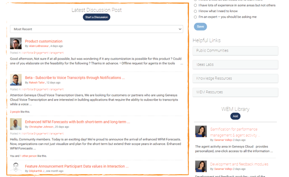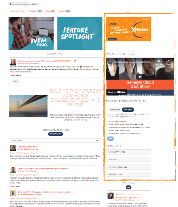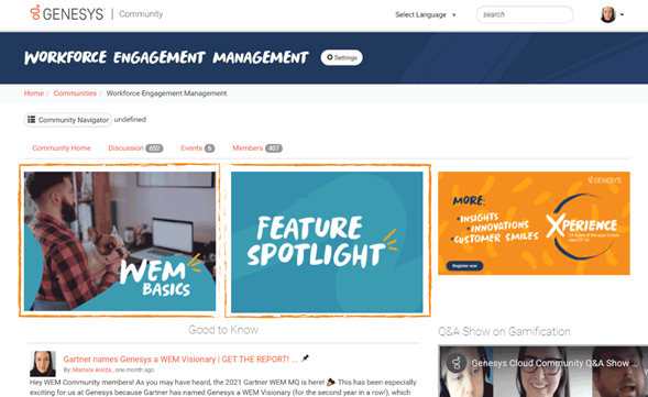 Firstly, you'll find a couple of helpful tiles at the top of our community home. These will lead you to the latest in Genesys WEM product feature release and capability information on our library (Feature Spotlight). And, for those just starting out with WEM, we've created a section (WEM Basics) to help you navigate the wonderful (and sometimes weird) world of Workforce Engagement Management.