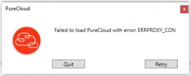 That's a fairly generic error that indicates that Genesys Cloud is unable to access the internet due to some proxy issue. There are a number of internet resources for troubleshooting proxy issues that might be beneficial. I'm unsure how your organization is administering your Genesys Cloud installations but it could be that there are registry entries installed by your organization's IT to configure the proxy server for Genesys Cloud and that whatever proxy configuration is being configured is not working correctly. You can take a look at the registry entries in registry edit and look in Computer\HKEY_CURRENT_USER\Software\Interactive Intelligence\Purecloud\Directory. If there's one called ProxyServer that's what being used... either correct it or, if it's unnecessary, delete it.